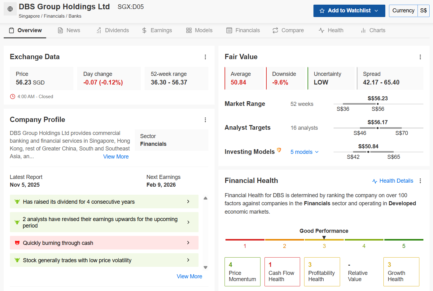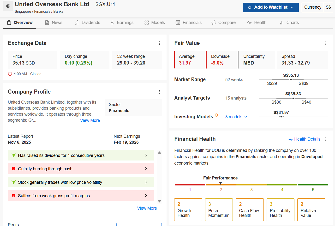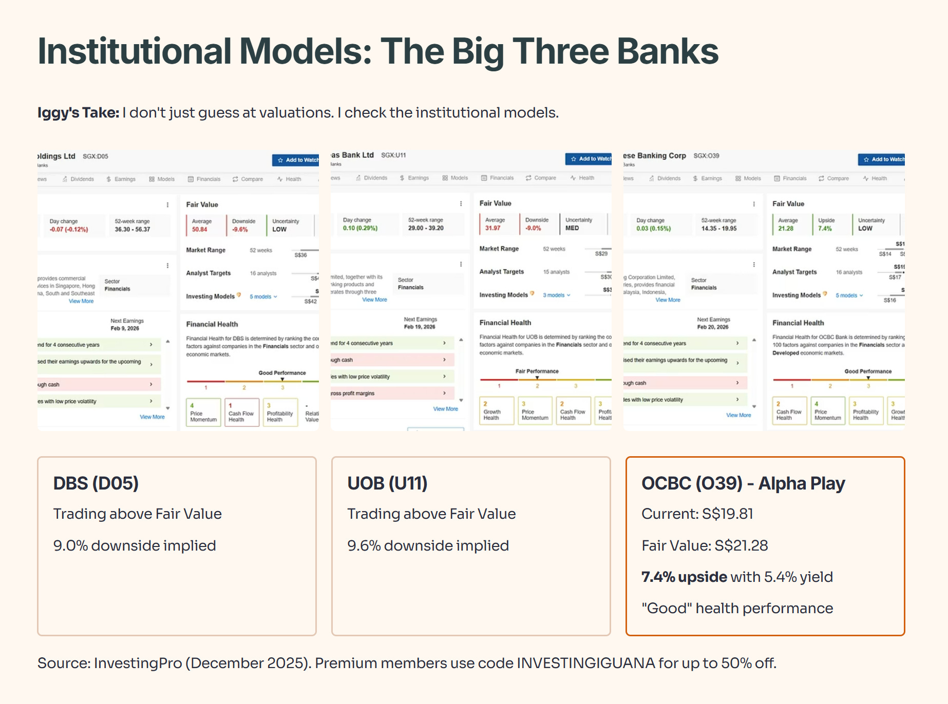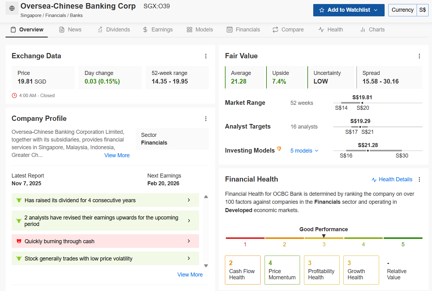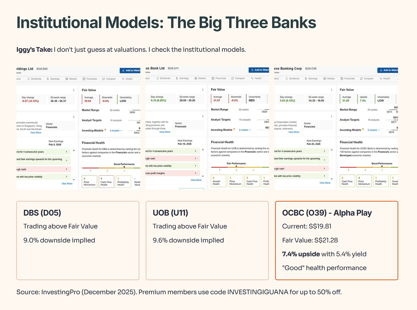 The data currently shows a fascinating divergence. While DBS (D05) and UOB (U11) are trading above their InvestingPro Fair Value (implying a 9.0% to 9.6% downside), OCBC (O39) remains the “Alpha” play. It is currently trading at S$19.81, showing a **7.4% upside** to its Fair Value of S$21.28 with a “Good” health performance.