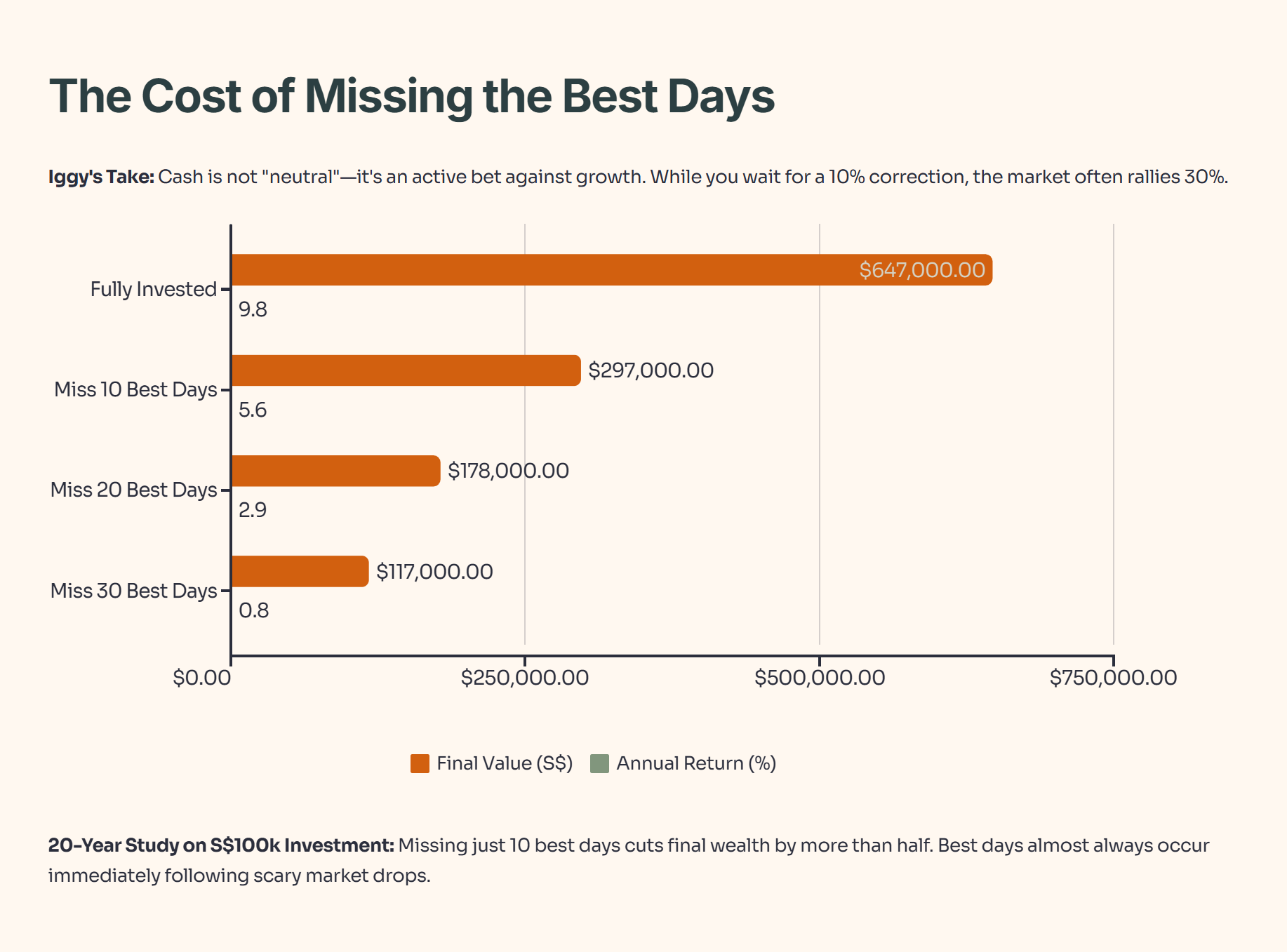 Iggy’s Take: Cash is not a “neutral” position; it is an active bet against global growth. While you wait for a 10% correction, the market often rallies 30%. You are paying a massive “opportunity tax” for the illusion of safety.