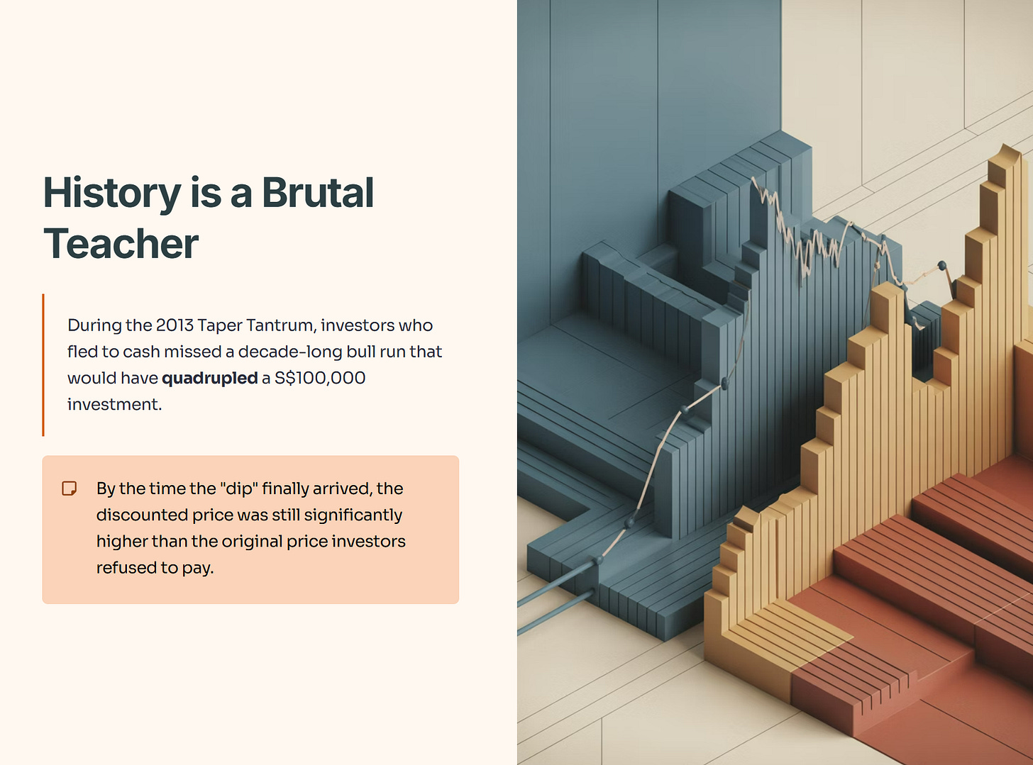 However, history is a brutal teacher. During the 2013 Taper Tantrum, investors who fled to cash to “avoid the crash” missed a decade-long bull run that would have quadrupled a S$100,000 investment. By the time the “dip” finally arrived, the discounted price was still significantly higher than the price they originally refused to pay.