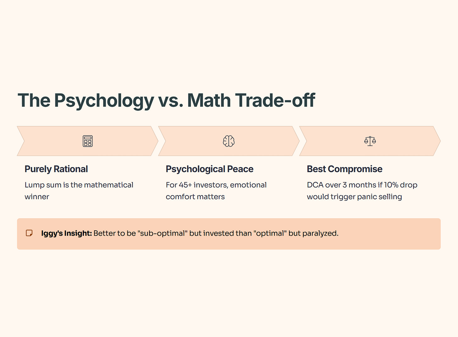 Iggy’s Insight: If you are a purely rational math-driven investor, Lump Sum is the winner. However, for my 45+ audience, psychological peace matters. If a 10% drop next week would make you sell in a panic, then DCA over 3 months is your best compromise. It’s better to be “sub-optimal” but invested than “optimal” but paralyzed.