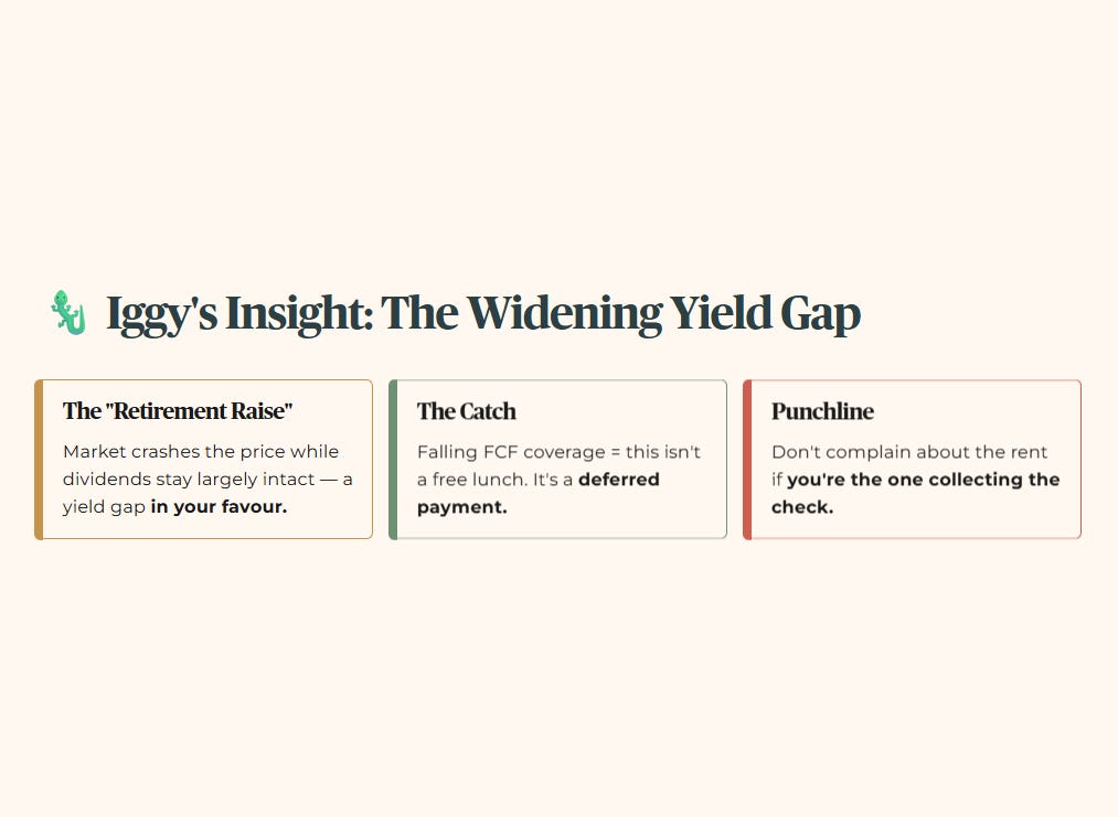 The “Wealth Check” shows a widening Yield Gap. The market is giving you a “Retirement Raise” by crashing the price while the dividends remain largely intact. However, the falling FCF coverage tells me this isn’t a “free lunch”—it’s a “deferred payment.”