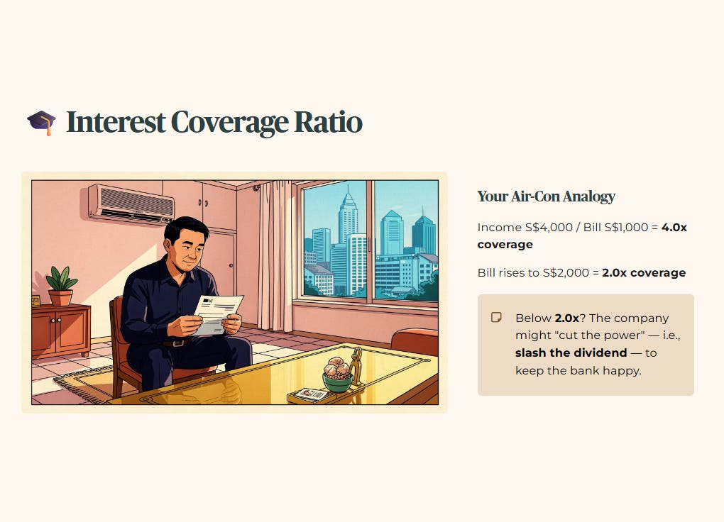 Think of this as your ability to pay for your air-con and electricity after paying the bank. If your income is S$4,000 and your bill is S$1,000, your coverage is 4.0x. If the bill goes up to S$2,000, your coverage drops to 2.0x.