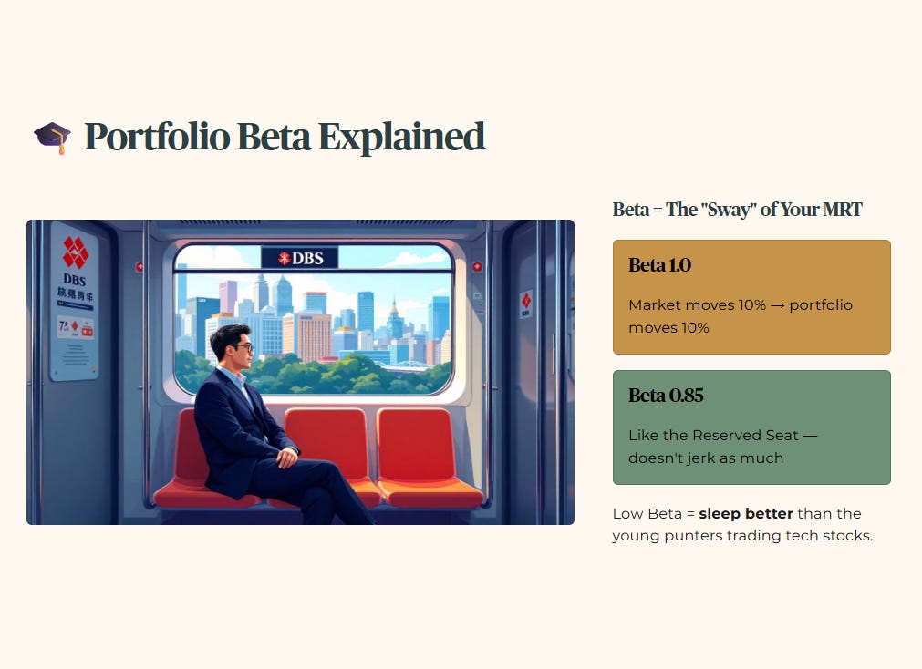 Beta is like the “sway” of an MRT train. A Beta of 1.0 means if the market moves 10%, your portfolio moves 10%. A Beta of 0.85 means your portfolio is like the “Reserved Seat”—it doesn’t move as much when the train jerks.