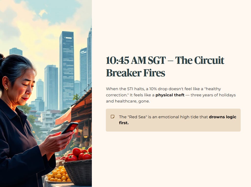At 10:45 AM SGT, when the SGX circuit breaker slammed the brakes on the Straits Times Index, the silence in the local brokerage apps was deafening. For a retiree, a 10% market drop isn’t an “Entry Window Analysis” or a “healthy correction.” It feels like a physical theft—a hand reaching into your CPF LIFE bucket and scooping out three years of future holidays and healthcare. The “Red Sea” is an emotional high tide that drowns logic first.