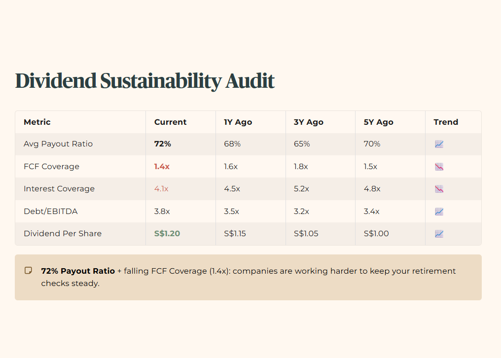 The 72% Payout Ratio is the number to watch. While the Dividend Per Share (DPS) has risen to S$1.20, the Free Cash Flow (FCF) Coverage has dipped to 1.4x.