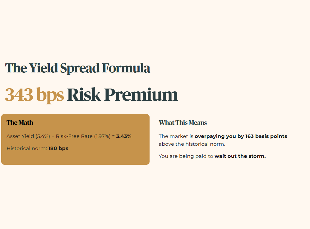In prose: The market is currently paying you a 343 basis point premium over the government bond. This is significantly higher than the historical norm of 180 basis points. You are being “overpaid” to wait out the storm.
