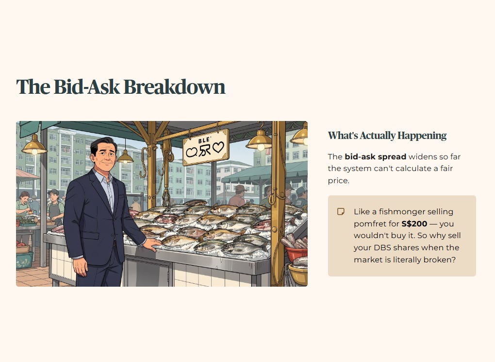 In Singaporean terms, it’s like a wet market where the fishmonger goes for a toilet break and a random passerby tries to sell you a pomfret for S$200. You wouldn’t buy it, so why would you sell your DBS shares when the market is literally broken?