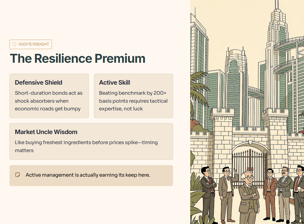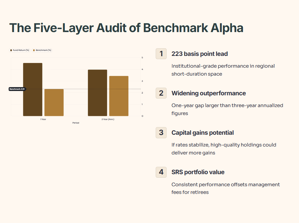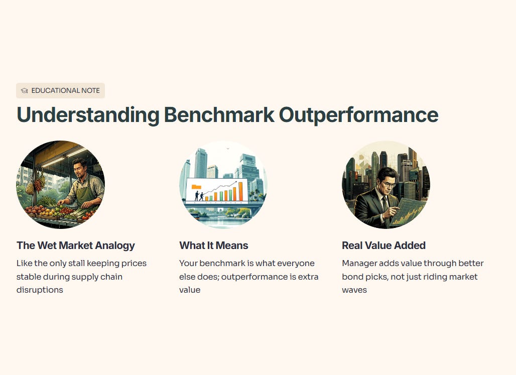 Let’s pause on that term. Beating a benchmark is like being the only stall in the wet market that manages to keep prices stable when a supply chain disruption hits. Your benchmark is what everyone else is doing; your outperformance is the extra value you provide through better sourcing. So what does this mean for you? It means the fund manager is actually adding value through their bond picks rather than just riding a market wave.