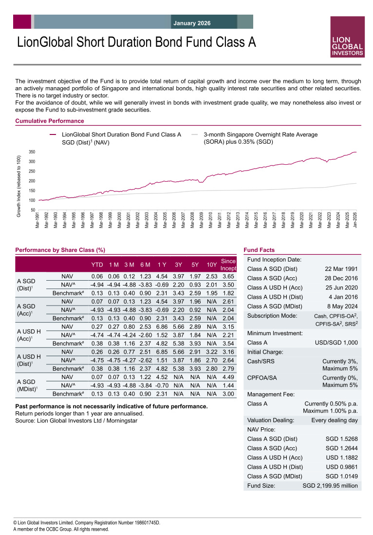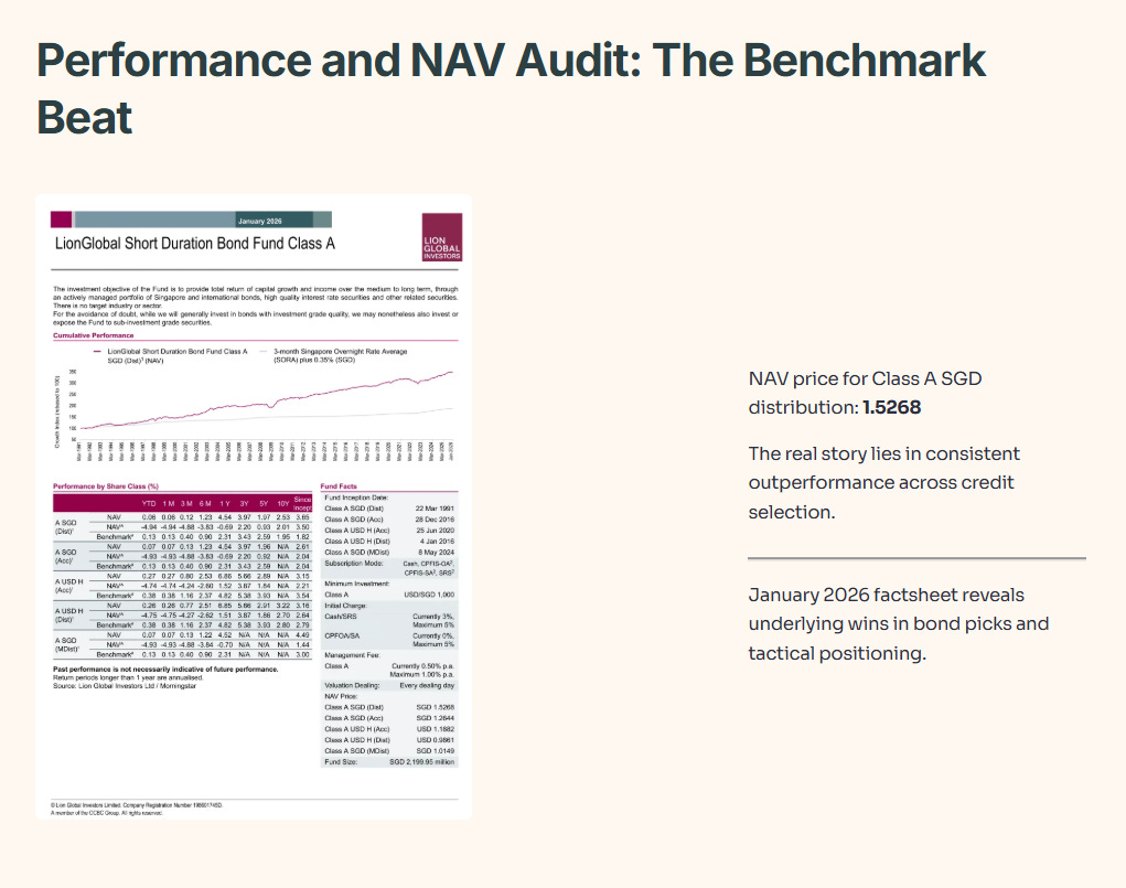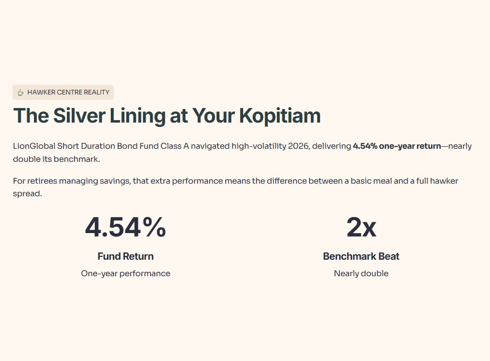 The LionGlobal Short Duration Bond Fund Class A has successfully navigated a high-volatility 2026 environment to deliver a one-year return of 4.54 percent, which is nearly double its benchmark. For a retiree managing their savings, that extra performance is not just a number on a page; it is the difference between a basic meal and a full spread at the hawker centre.