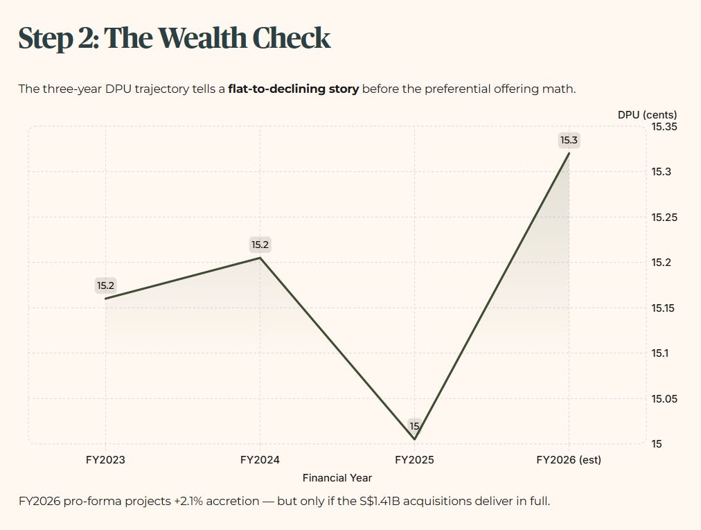 The three-year DPU trajectory tells a flat-to-declining story before we even get to the preferential offering math.