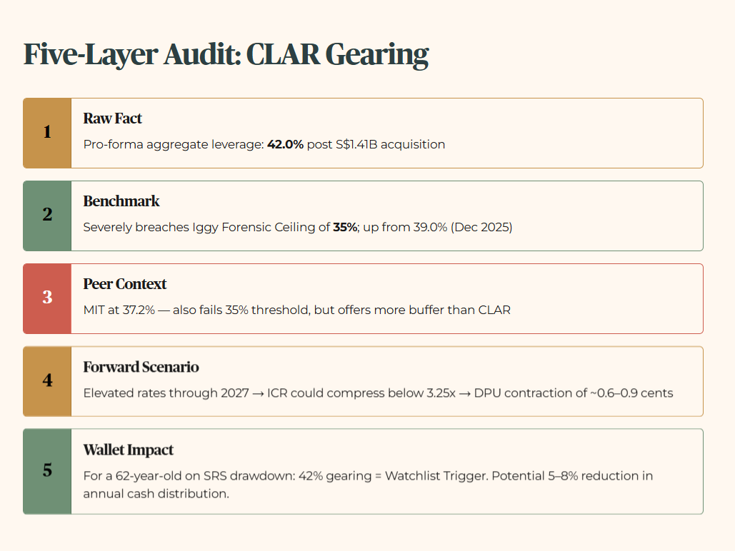 Layer 3 — Peer Context Mapletree Industrial Trust (MIT) currently maintains an aggregate leverage of 37.2%, which also fails the absolute 35% sanctuary threshold but offers a more robust buffer than CLAR’s pro-forma position.