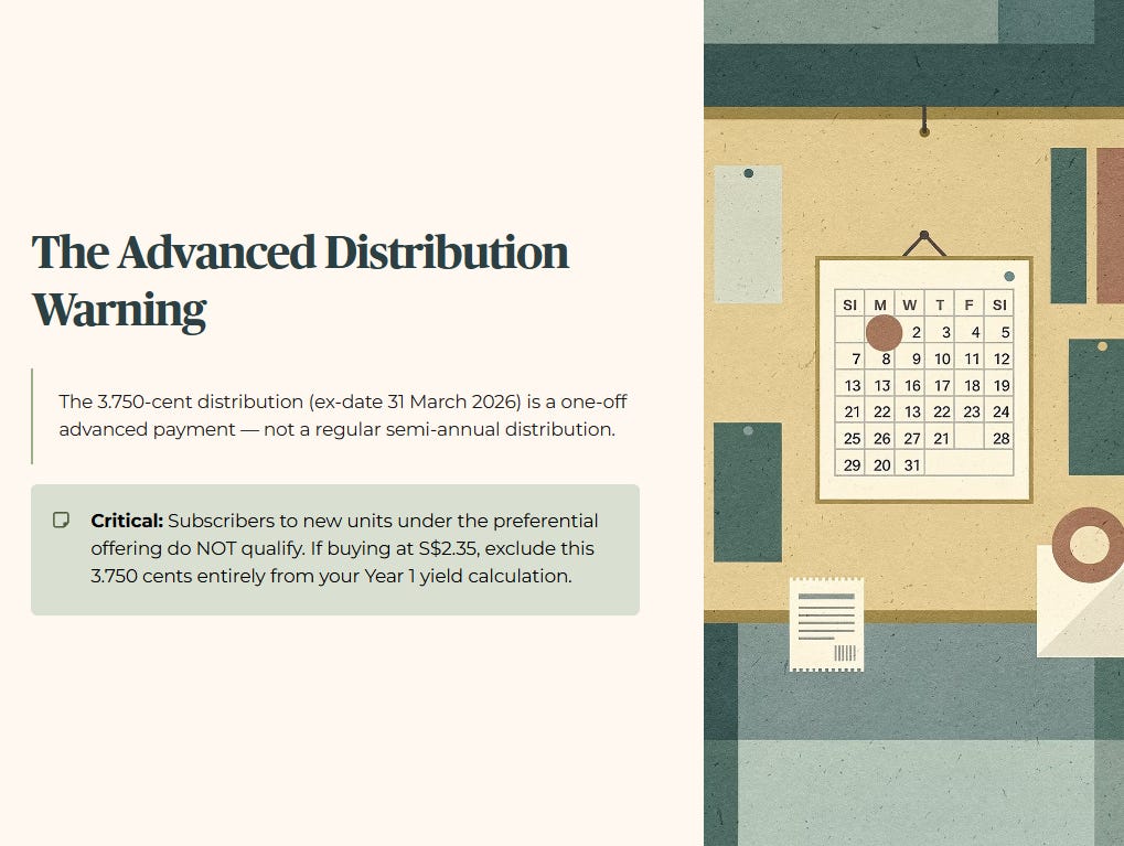 A note on the advanced distribution: The 3.750-cent distribution with an ex-date of 31 March 2026 is a one-off advanced distribution covering the period 1 January 2026 to 1 April 2026, declared specifically in connection with this equity fundraise. It is not a regular semi-annual payment. Unitholders subscribing to new units under the preferential offering do not qualify for this distribution. If you are buying at S$2.35, your effective Year 1 yield calculation must exclude this 3.750 cents entirely.