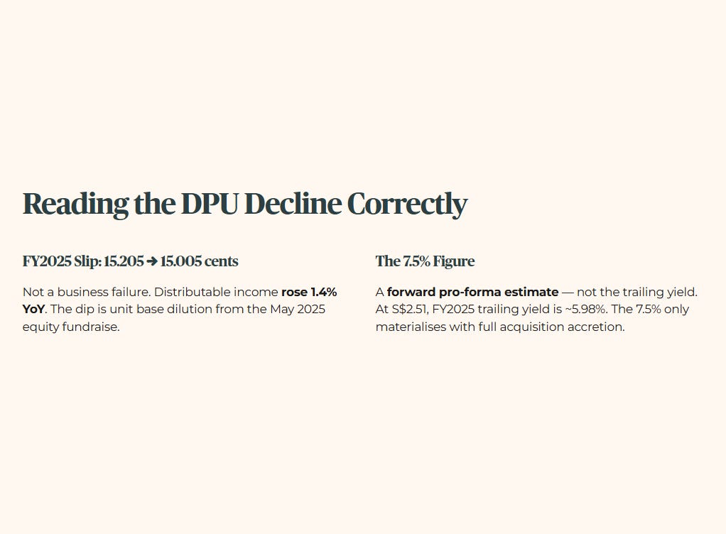 The FY2025 decline from 15.205 cents to 15.005 cents is not a business failure. Distributable income itself rose 1.4% year-on-year. The DPU slippage is a unit base dilution effect from the May 2025 equity fundraise. At the current price of S$2.51, the FY2025 trailing yield is approximately 5.98%. The 7.5% figure cited in this audit is a forward pro-forma estimate that only materialises if the S$1.41 billion acquisitions deliver the projected 2.1% DPU accretion in full.