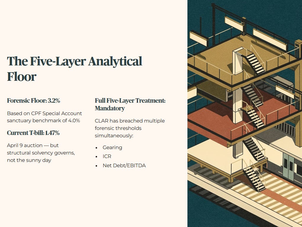 For a titan like CLAR, we audit for the storm, not the sunny day. While the current 6-month Singapore T-bill reached a cut-off yield of 1.47% in the April 9 auction, structural solvency is the governing question. Because CLAR has breached multiple forensic thresholds — specifically gearing, ICR, and Net Debt/EBITDA — the Full Five-Layer treatment is mandatory.