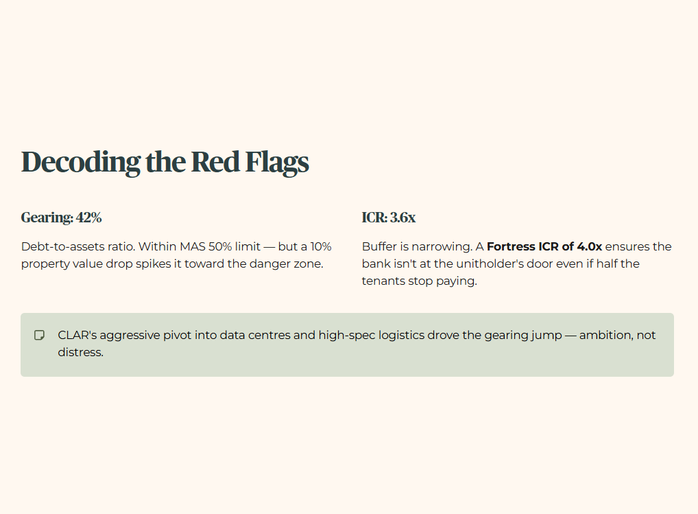 Gearing is simply the ratio of a REIT’s total debt to its total assets. It tells us how much of the “house” is owned by the bank. CLAR’s pro-forma jump to 42% is a consequence of its aggressive pivot into New Economy assets like data centres and high-spec logistics. While it remains within the MAS regulatory limit of 50%, it leaves very little headroom for asset devaluations. If property values drop by just 10% in a global slowdown, that gearing ratio would spike toward the danger zone.