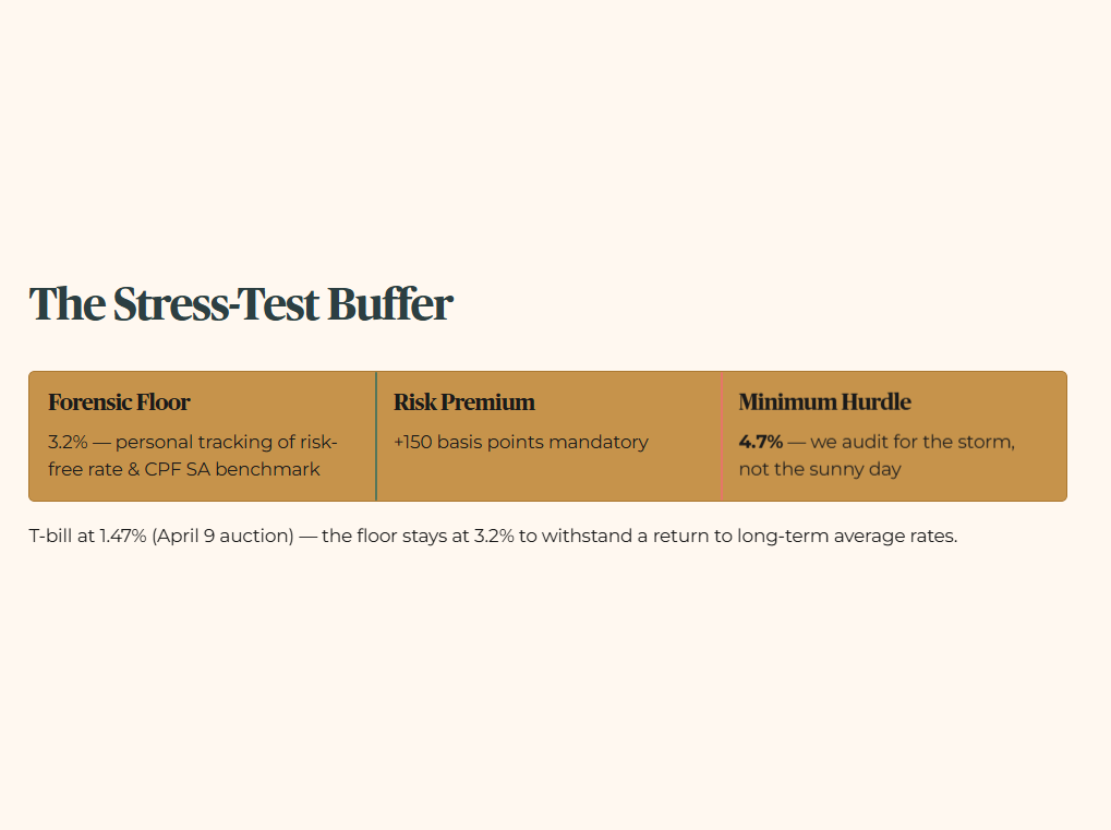 The Stress-Test Buffer: For this audit, I apply a conservative floor of 3.2%. We audit for the storm, not just the sunny day. While the T-bill sits at 1.47% from the April 9 auction, I do not lower my standards to match a temporary market dip. My floor remains at 3.2% to ensure sanctuary assets can withstand a return to long-term average interest rates. The minimum yield hurdle is 4.7%: that is the 3.2% floor plus 150 basis points of mandatory risk premium.