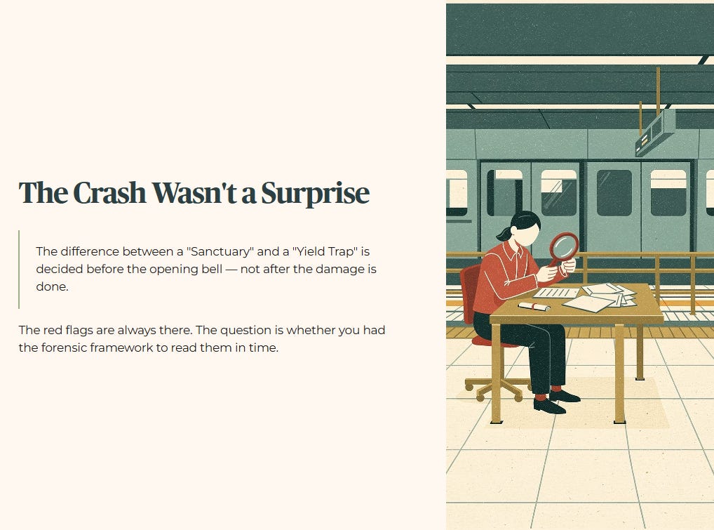 The Crash Wasn’t a Surprise. In this market, the difference between a “Sanctuary” and a “Yield Trap” is decided before the opening bell — not after the damage is done. The red flags are always there. The question is whether you had the forensic framework to read them in time.