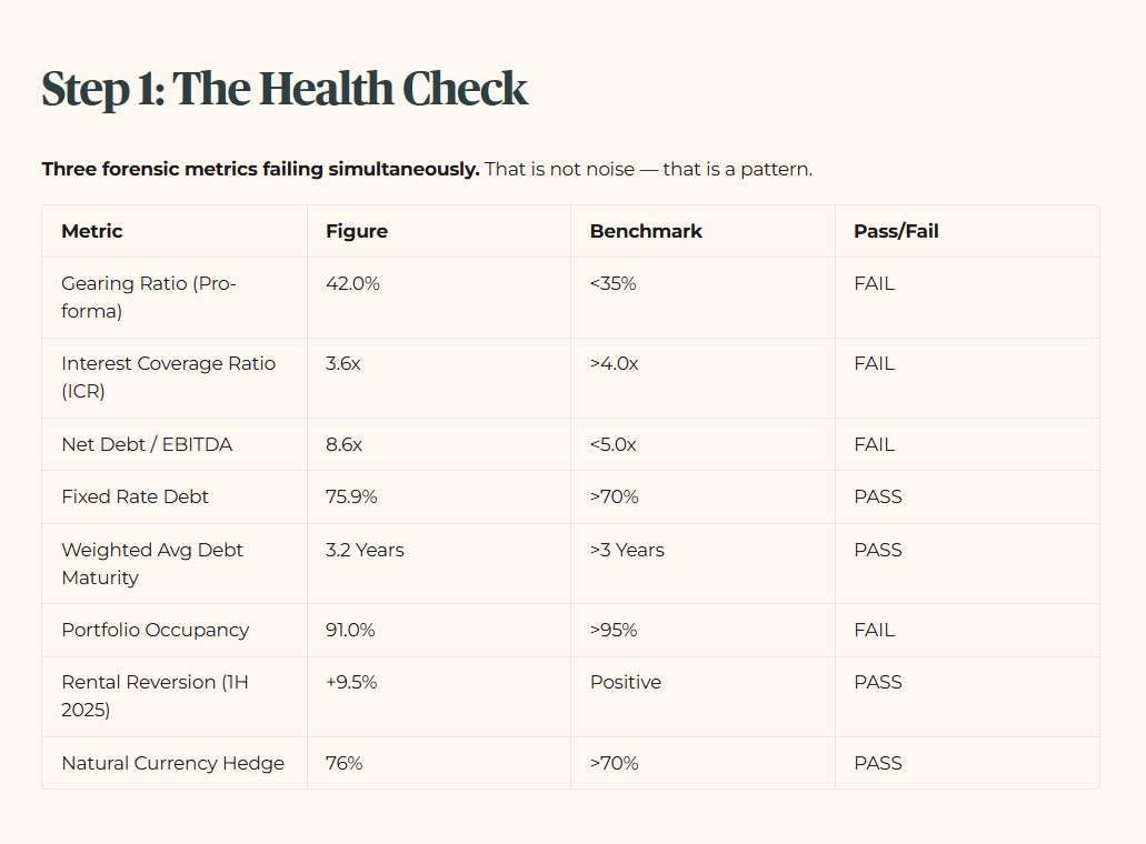 The Interest Coverage Ratio measures how many times the REIT can pay its interest expenses using its operating profit. A ratio of 3.6x means the buffer is narrowing. In forensic terms, a Fortress ICR of 4.0x or higher ensures that even if half the tenants stop paying rent, the bank is not coming to the unitholder’s door.