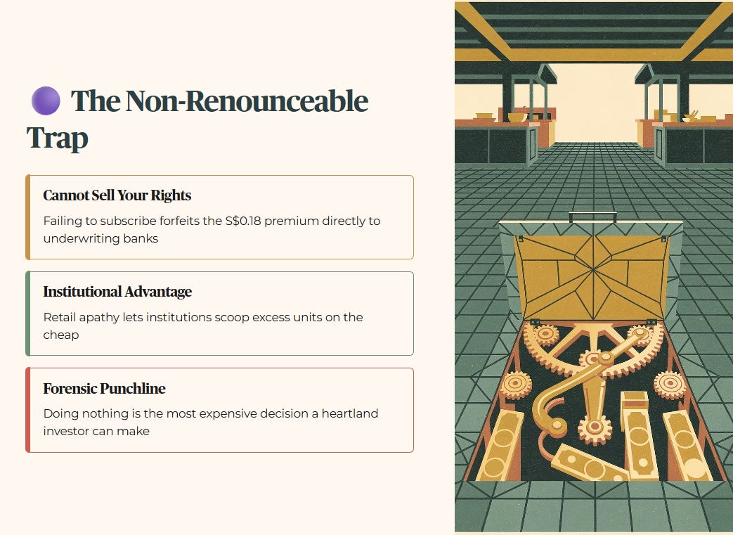 A non-renounceable preferential offering is fundamentally coercive. Because you cannot sell your rights on the open market, failing to subscribe means you forfeit the S$0.18 premium between the S$2.35 issue price and the current S$2.53 market price directly to the underwriting banks. This is not merely an investment choice. It is a defensive necessity to prevent the absolute dilution of your equity base. Institutional players rely on retail apathy during these corporate actions to scoop up excess units on the cheap. Leaving your allotment on the table is a permanent, unforced surrender of capital.
