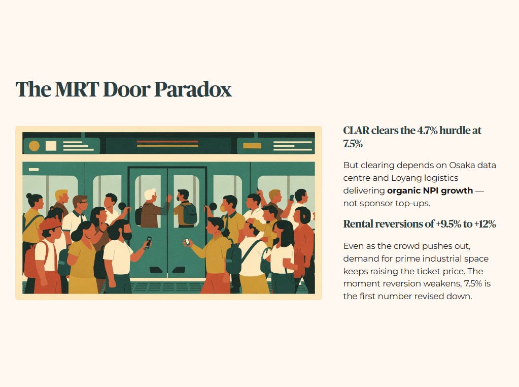 At the forward pro-forma yield of 7.5%, CLAR clears that hurdle. But the clearing depends entirely on the Osaka data centre and Loyang logistics cluster delivering organic NPI growth, not sponsor top-ups. CLAR’s ability to command rental reversions of +9.5% to +12% is the MRT Door Paradox in action: even as the crowd pushes to get out, the demand to get into prime industrial space remains strong enough that the manager keeps raising the ticket price. The moment that reversion trend weakens, the 7.5% forward estimate becomes the first number to be revised downward.
