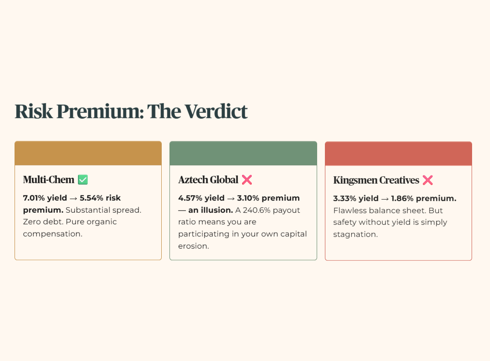 Now that the 4.7% hurdle is hard-coded, the next step is to run Multi-Chem, Aztech, Kingsmen, and Vicom through a yield‑minus‑T‑Bill screen — and one of the “income” counters you have just read about mathematically fails the sanctuary test the moment this calculation is applied.