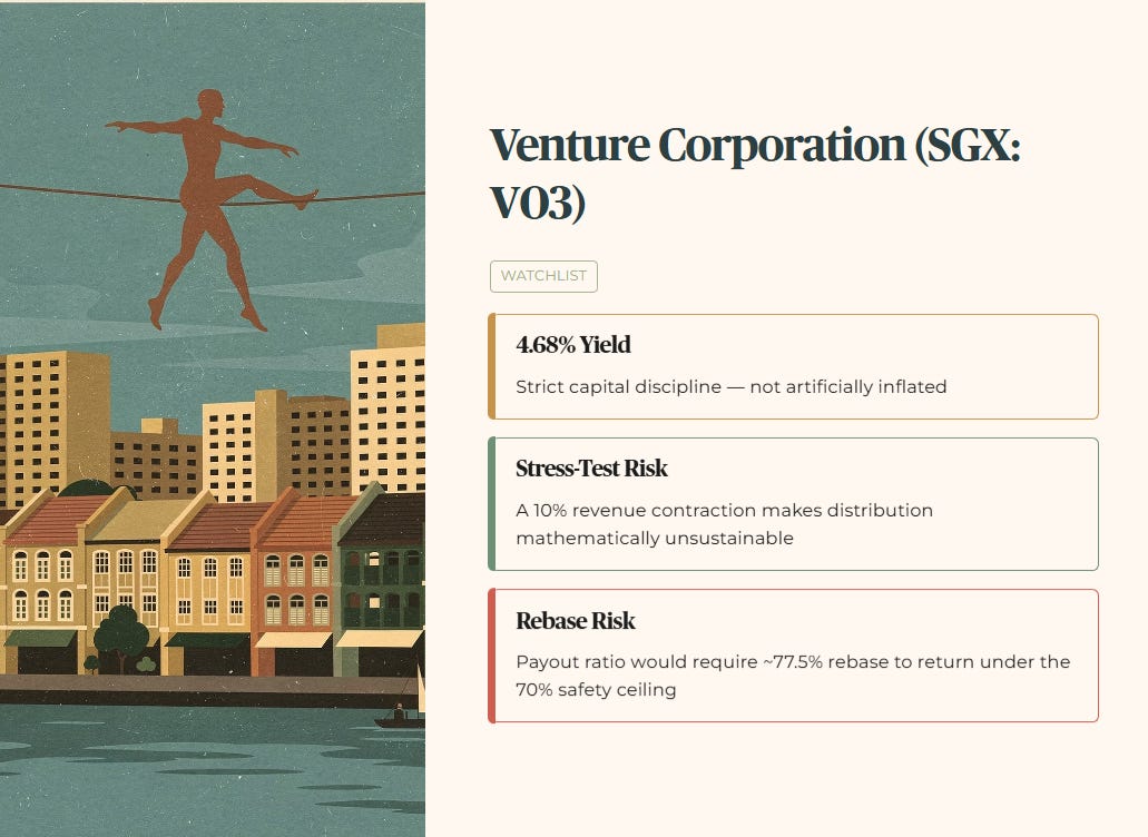 Venture Corporation (SGX: V03) currently sits at a 4.68% yield, maintaining strict capital discipline rather than artificially inflating its distributions to appease the market. However, the forensic stress-test produces an uncomfortable modelled scenario: if a macro demand contraction in technology hardware exports reduces revenue by 10%, the distribution could become mathematically unsustainable under that modelled condition, requiring a dividend rebase in the vicinity of 77.5% to bring the payout ratio back under the 70% structural safety ceiling. For a 62-year-old in Toa Payoh managing an SRS drawdown, this constitutes a material Watchlist risk that warrants close monitoring before any capital commitment.