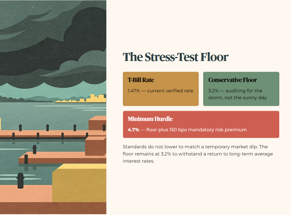 Note on the Stress-Test Buffer: For this audit, I apply a conservative floor of 3.2%. We audit for the storm, not just the sunny day. While the T-Bill sits at 1.47%, I do not lower my standards to match a temporary market dip. My floor remains at 3.2% to ensure sanctuary assets can withstand a return to long-term average interest rates. The minimum yield hurdle is 4.7% — that is the 3.2% floor plus 150 basis points of mandatory risk premium.