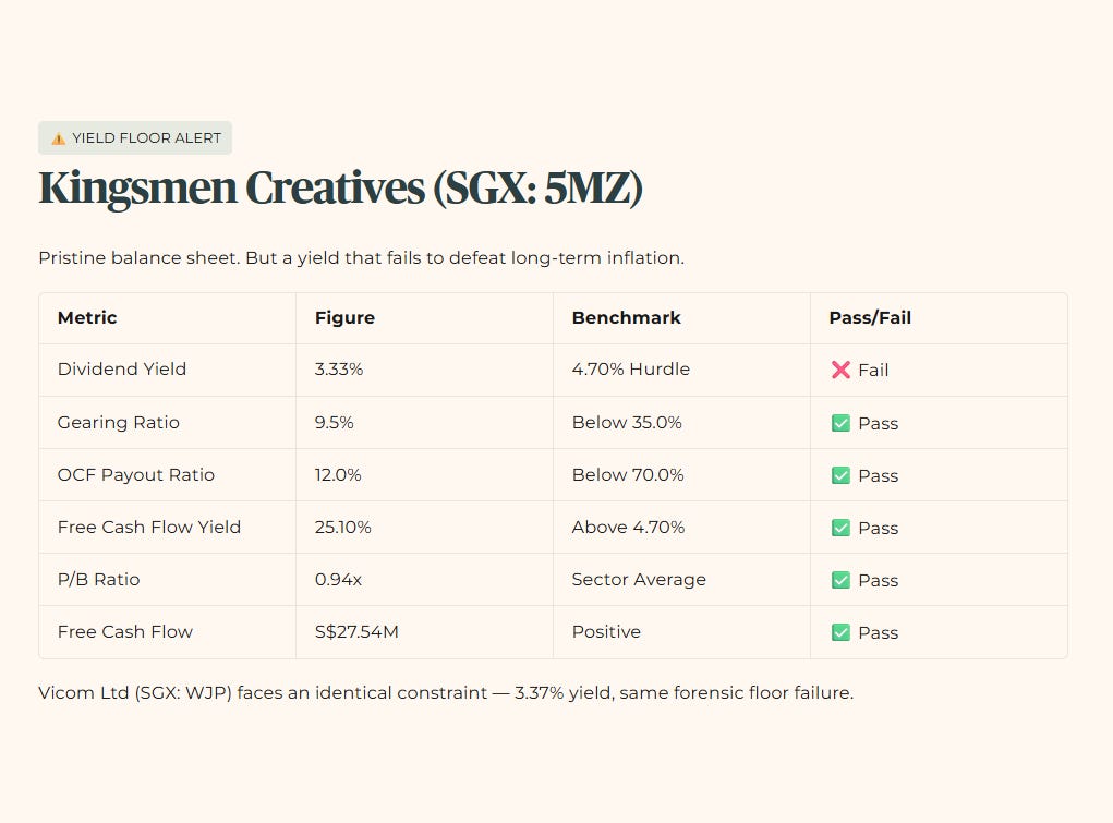 Kingsmen Creatives generated S$33.5 million in operating cash flow to comfortably fund a highly conservative S$4 million dividend. However, the 3.33% yield falls critically below Iggy’s 4.7% minimum hurdle, despite the 12.0% payout ratio sitting vastly superior to the company’s three-year historical average. Vicom Ltd (SGX: WJP) faces an identical structural constraint, currently posting a 3.37% yield that similarly fails the mandatory forensic floor.