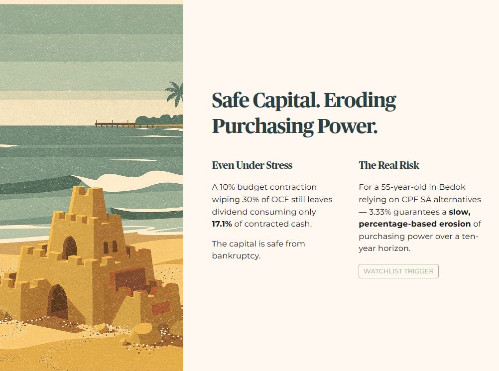If corporate exhibition budgets contract by 10%, wiping out 30% of operating cash flow, the dividend still only consumes 17.1% of the newly contracted cash, leaving the distribution mathematically secure but inflation-exposed. For a 55-year-old in Bedok relying on CPF SA alternatives, this is a Watchlist Trigger. The capital is perfectly safe from bankruptcy, but the 3.33% return guarantees a slow, percentage-based erosion of your purchasing power over a ten-year horizon.