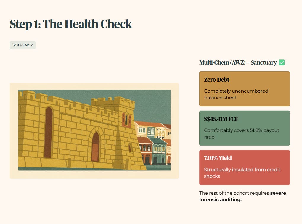 We subject every active thesis to the Triage Rule. Multi-Chem (SGX: AWZ) clears the threshold completely, operating a zero-debt balance sheet that generates S$45.41 million in free cash flow to comfortably cover its highly disciplined 51.8% payout ratio. For a 58-year-old in Toa Payoh managing an SRS drawdown, this acts as a Sanctuary asset, providing an unencumbered 7.01% yield structurally insulated from credit shocks.