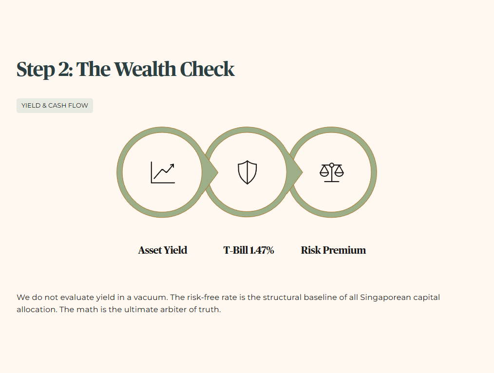 We do not evaluate yield in a vacuum. The structural baseline of all Singaporean capital allocation is the prevailing risk-free rate. The calculation to determine if you are adequately compensated for holding equity risk is non-negotiable: Asset Yield (%) minus the current T-Bill rate equals your Risk Premium. With the current T-Bill verified at 1.47%, the math becomes the ultimate arbiter of truth.