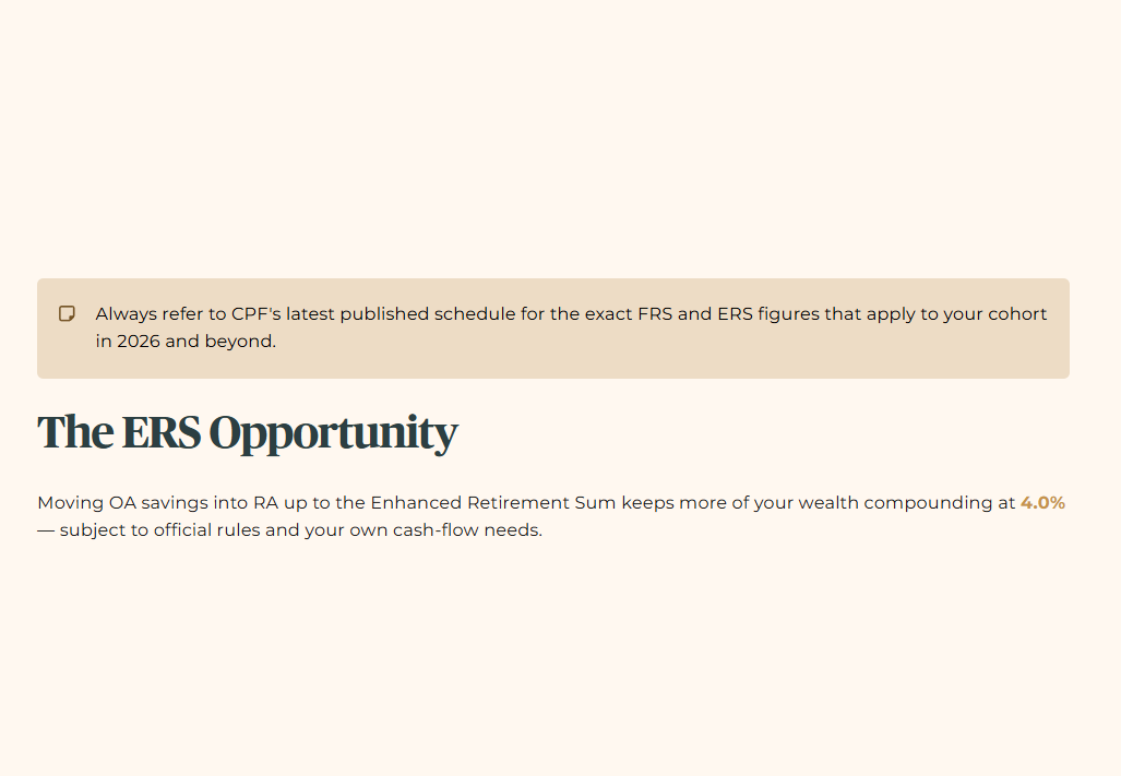 The key adjustment here is this: if you want more of your wealth to earn 4.0% in retirement, you should aim to move as much as possible from OA into RA up to the ERS limit for your cohort, subject to official rules and your own cash‑flow needs. For the exact FRS and ERS figures that apply to you in 2026 and beyond, always refer to CPF’s latest published schedule.