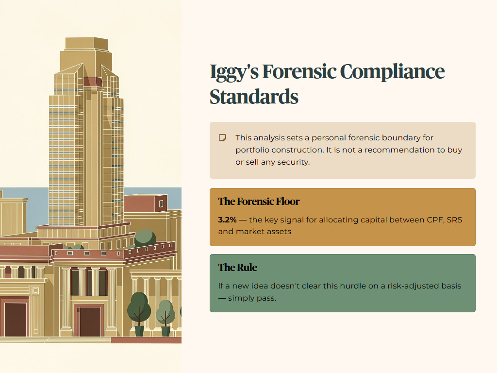 For my own retirement architecture, I track a 3.2% Forensic Floor as the key signal for how I allocate capital between CPF, SRS and market assets. If a new idea does not clear this hurdle on a risk‑adjusted basis, I simply pass.