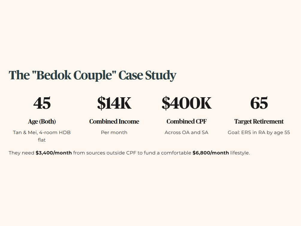 They currently have a combined $400,000 in CPF across OA and SA. Their strategy is to reach the ERS for their cohort in their RAs by age 55 through a mix of mandatory contributions and voluntary top‑ups. To fund a “comfortable” lifestyle of $6,800 a month, they calculate that they will need an additional $3,400 a month from sources outside CPF.