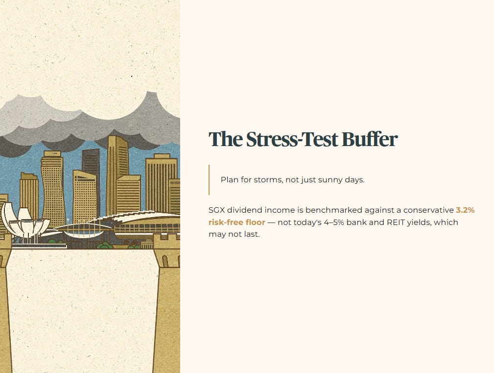 A crucial point in this projection is the stress‑test buffer. When estimating SGX dividend income against guaranteed CPF rates, the plan uses a conservative risk‑free floor of 3.2%. It does not assume that today’s 4% to 5% bank and REIT yields will last forever. The whole idea is to plan for storms, not just sunny days.