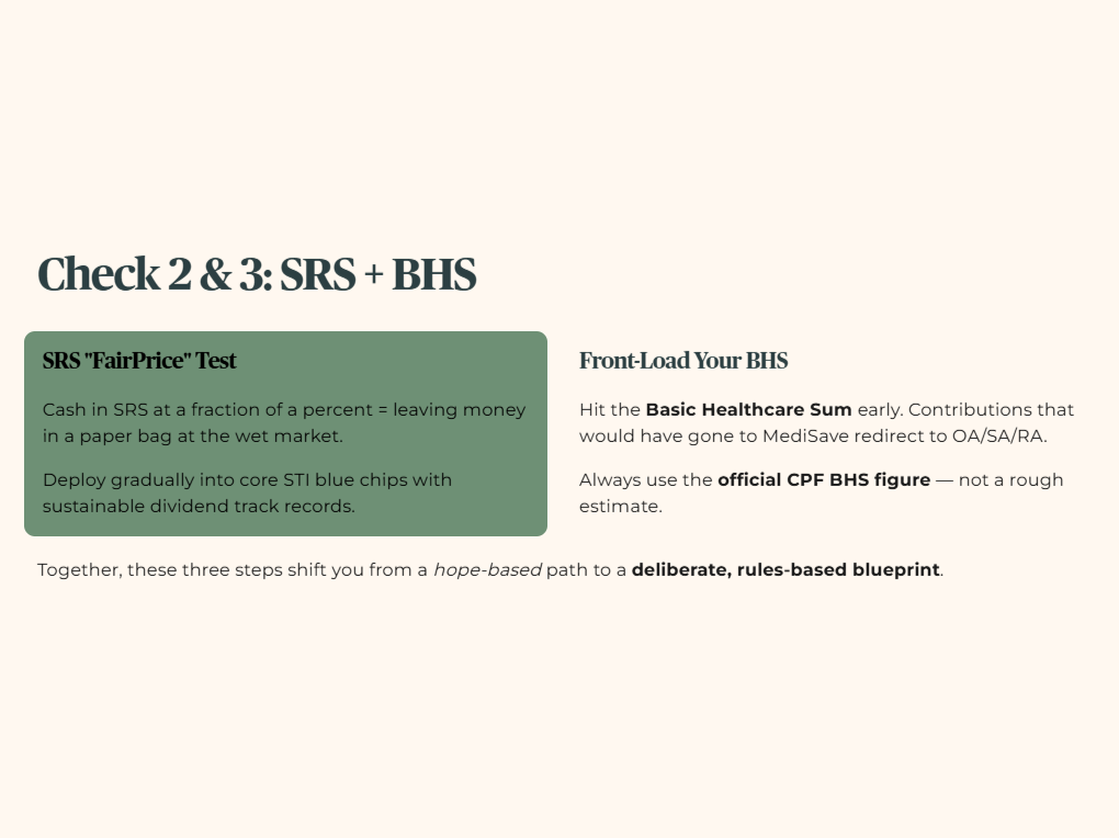 Third, front‑load your BHS. Keep an eye on your MediSave balance relative to the Basic Healthcare Sum that applies to your cohort, and aim to hit it early. Once you reach BHS, mandatory CPF contributions that would have gone into MediSave can be redirected more into OA, SA or RA, and you reduce the “silent leak” of cash used for insurance premiums that might otherwise have been automatically covered from MediSave. Always use the official BHS figure from CPF for the year in question, not a rough estimate.