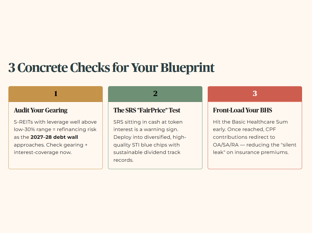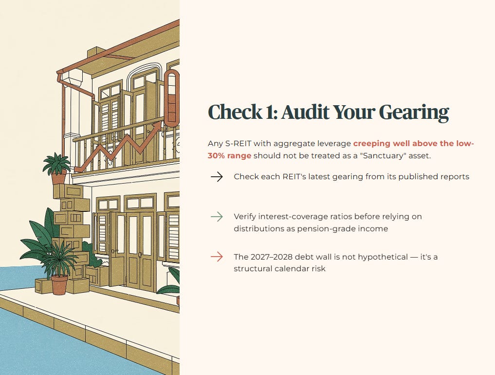 First, audit your gearing. Go through your S‑REIT holdings one by one. Any REIT with aggregate leverage creeping well above the low‑30% range should not automatically be treated as a “Sanctuary” asset. It will be more exposed to refinancing risk as the 2027–2028 debt wall approaches. Check each REIT’s latest gearing and interest‑coverage numbers from its latest reports before you rely on its distributions as pension‑grade income.