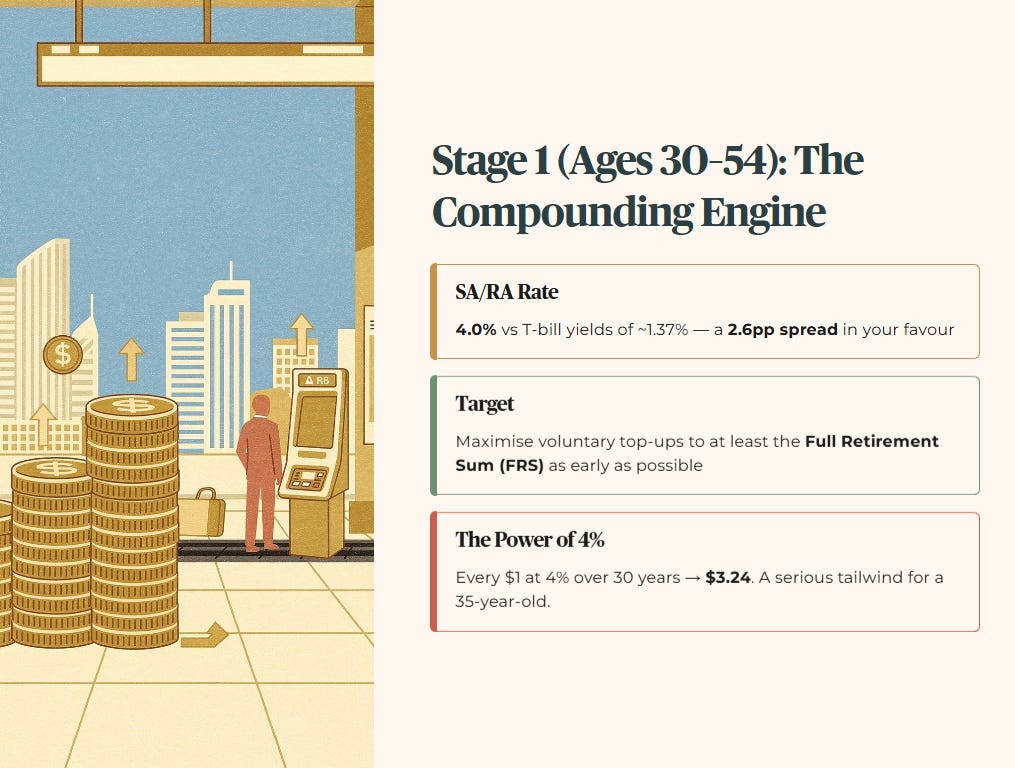 The strategy is simple: maximise voluntary top‑ups to at least the Full Retirement Sum (FRS) as early as you can reasonably afford.