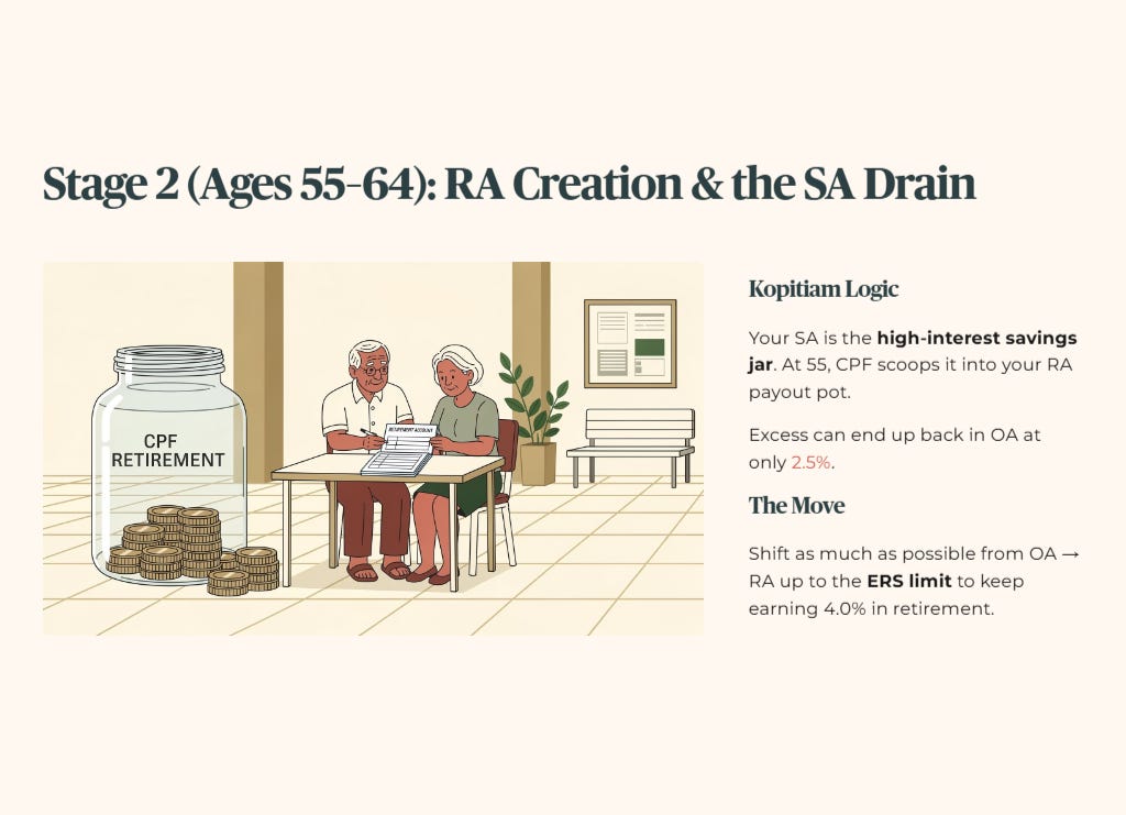 In “kopitiam logic” terms, think of your SA as a high‑interest savings jar. At 55, CPF scoops money out of that jar to fill your RA payout pot, and any excess can end up back in OA earning 2.5%. The SA is not literally abolished, but for most members the bulk of their SA savings is effectively swept into the RA at that point.