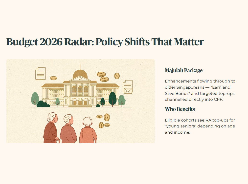 By early 2026, the Majulah Package enhancements and related schemes have started to flow through to older Singaporeans. The “Earn and Save Bonus” and other targeted top‑ups channel money directly into CPF for eligible cohorts, with some benefits flowing into RA balances for “young seniors” depending on age and income.