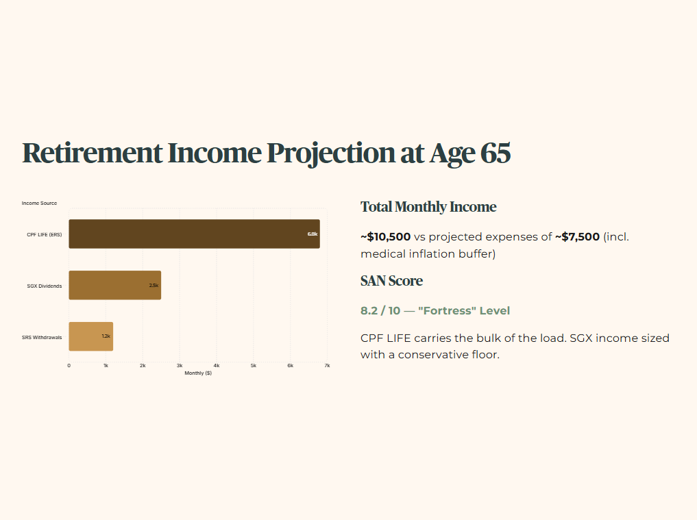 Altogether, that gives them about $10,500 in total monthly income. They project their monthly expenses, including a buffer for medical inflation, to be about $7,500. On these assumptions, their SAN (Sanctuary) score is 8.2 out of 10 — a “Fortress”‑level plan that should still hold up if market yields compress or expenses rise, because CPF LIFE carries the bulk of the load and the SGX income is sized with a conservative floor.