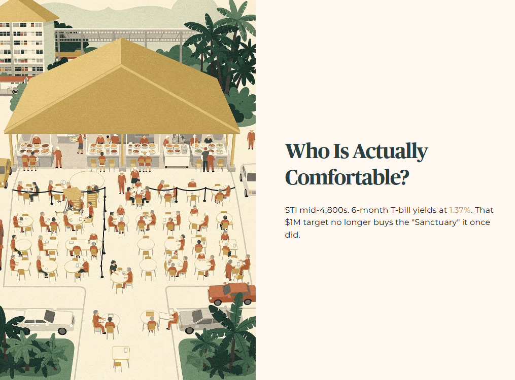 Most 45‑year‑old Singaporeans are staring at a $1 million retirement “target” as if it were a fixed destination. But in March 2026, with the Straits Times Index (STI) hovering in the mid‑4,800s and recent 6‑month T‑bill cut‑off yields around 1.37% per year, that million dollars no longer buys the same sense of “Sanctuary” it once did.