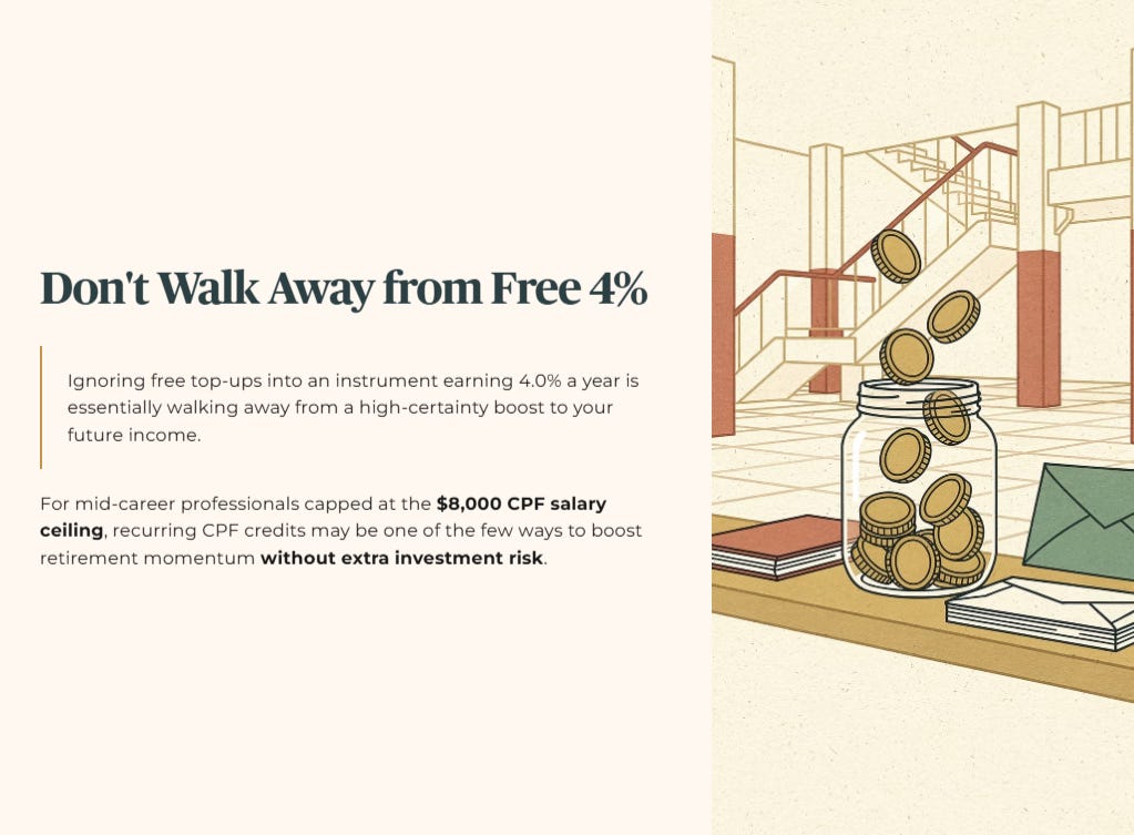 Ignoring free top‑ups into an instrument that currently earns 4.0% a year is essentially walking away from a high‑certainty boost to your future income.