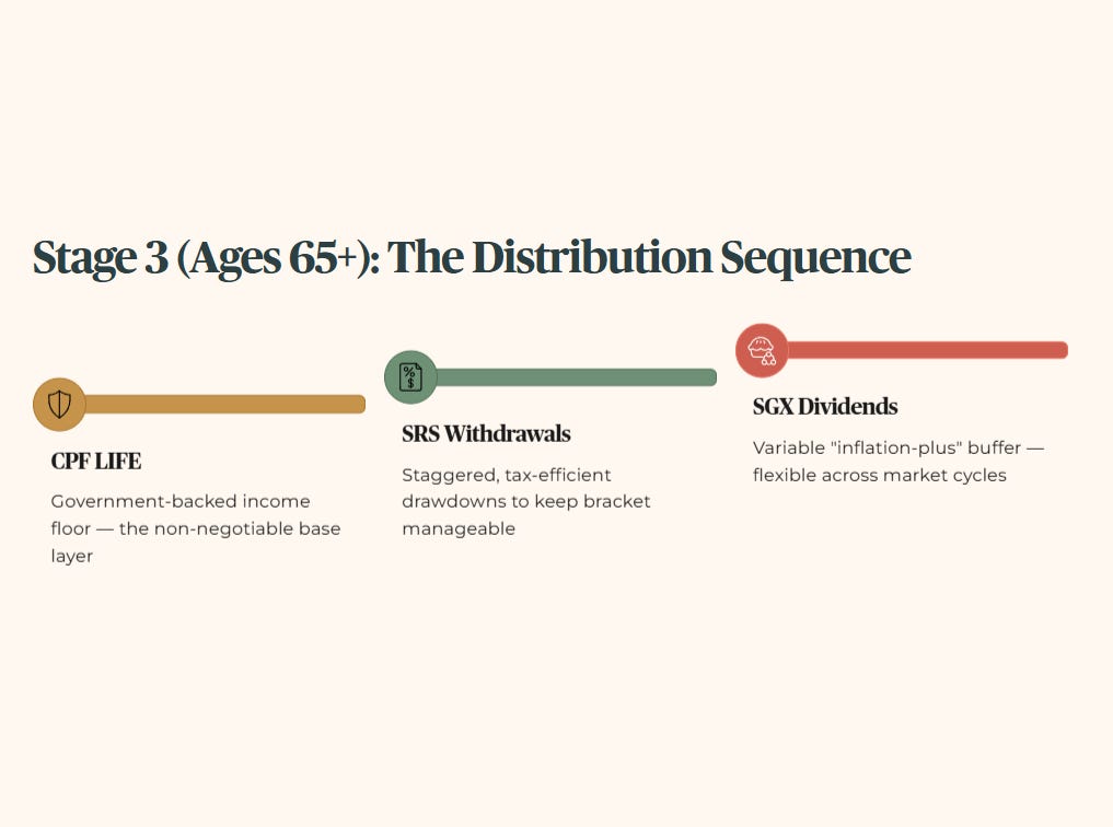 Your CPF LIFE payouts form your primary, government‑backed income floor based on your RA savings. On top of that, you draw down your SRS funds in a staggered, tax‑efficient way to keep your tax bracket manageable. Finally, you layer SGX dividends as your variable “inflation‑plus” buffer to sit above CPF LIFE and SRS.