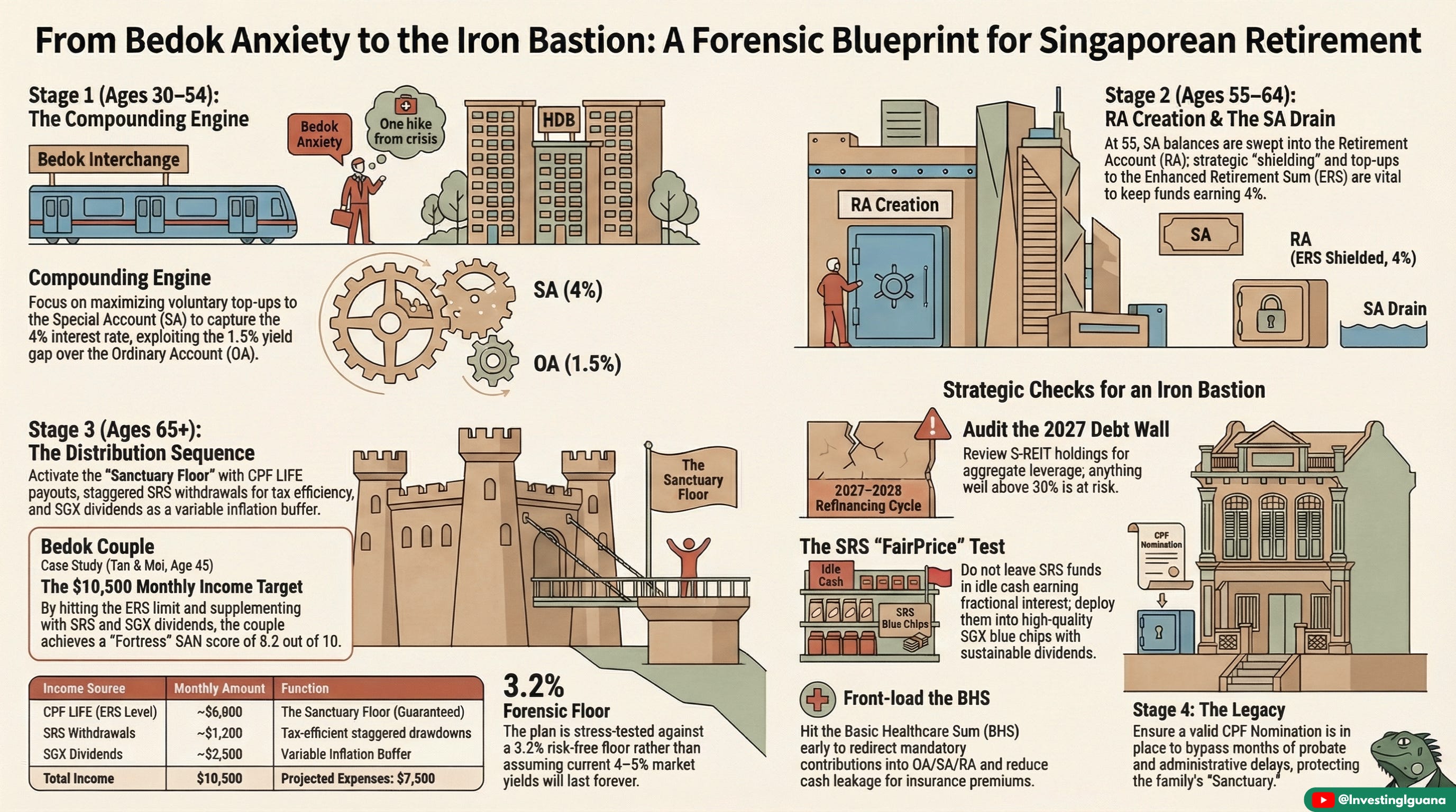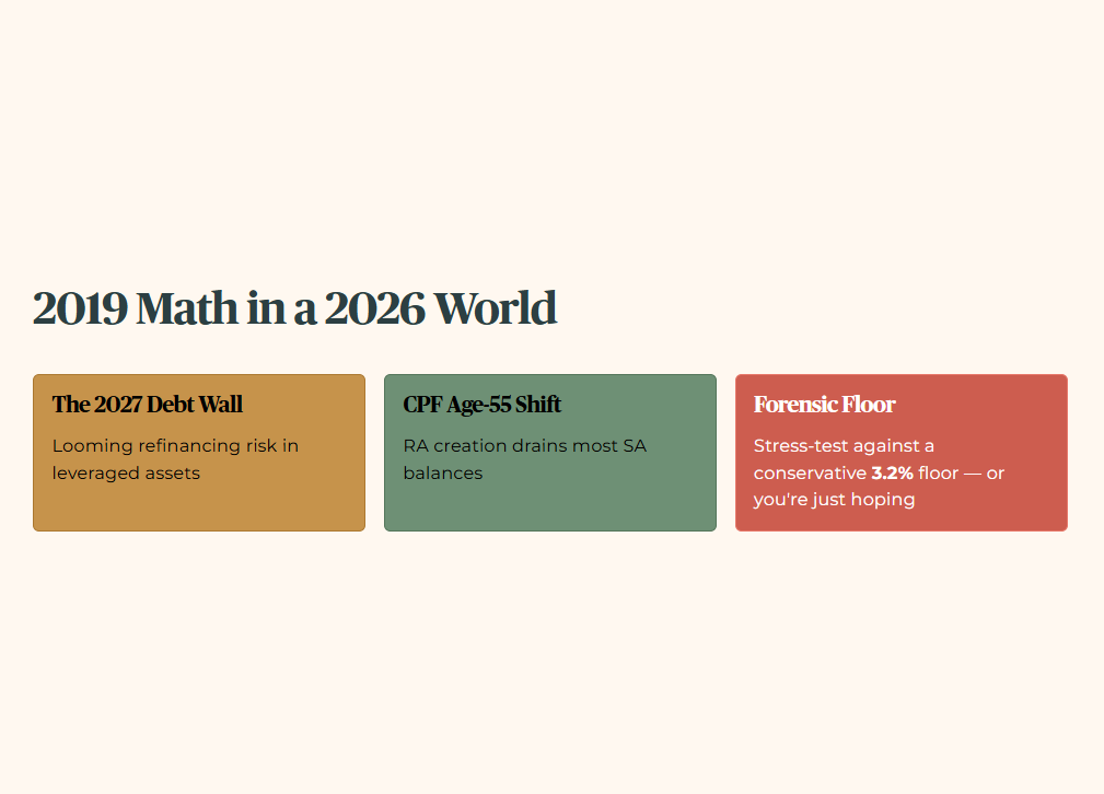 The uncomfortable truth is that most retail investors are still measuring their retirement readiness using 2019 math in a 2026 world. They are ignoring the looming “2027 Debt Wall” in leveraged assets and the way CPF mechanics change at age 55, when the creation of the Retirement Account (RA) effectively drains most of the balances in the Special Account (SA). If you are not stress‑testing your plan against a conservative 3.2% “Forensic Floor,” you are not really planning for retirement — you are just hoping for the best.