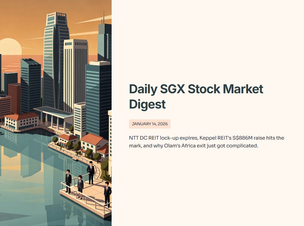 NTT DC REIT lock-up expires, Keppel REIT’s S$886M raise hits the mark, and why Olam’s Africa exit just got complicated.