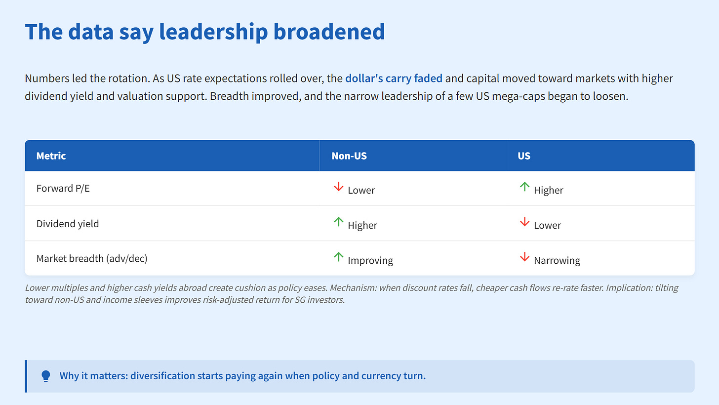 When people expected US interest rates to stop rising, the US dollar became less attractive to investors, so money started flowing out of the US and into other countries’ stock markets where companies pay better dividends and seem to be a better deal. Instead of just a few giant US companies dominating the market, lots of different stocks began to do well. This matters because it shows that spreading investments across more types of companies and countries can work out better when the rules and value of money change.