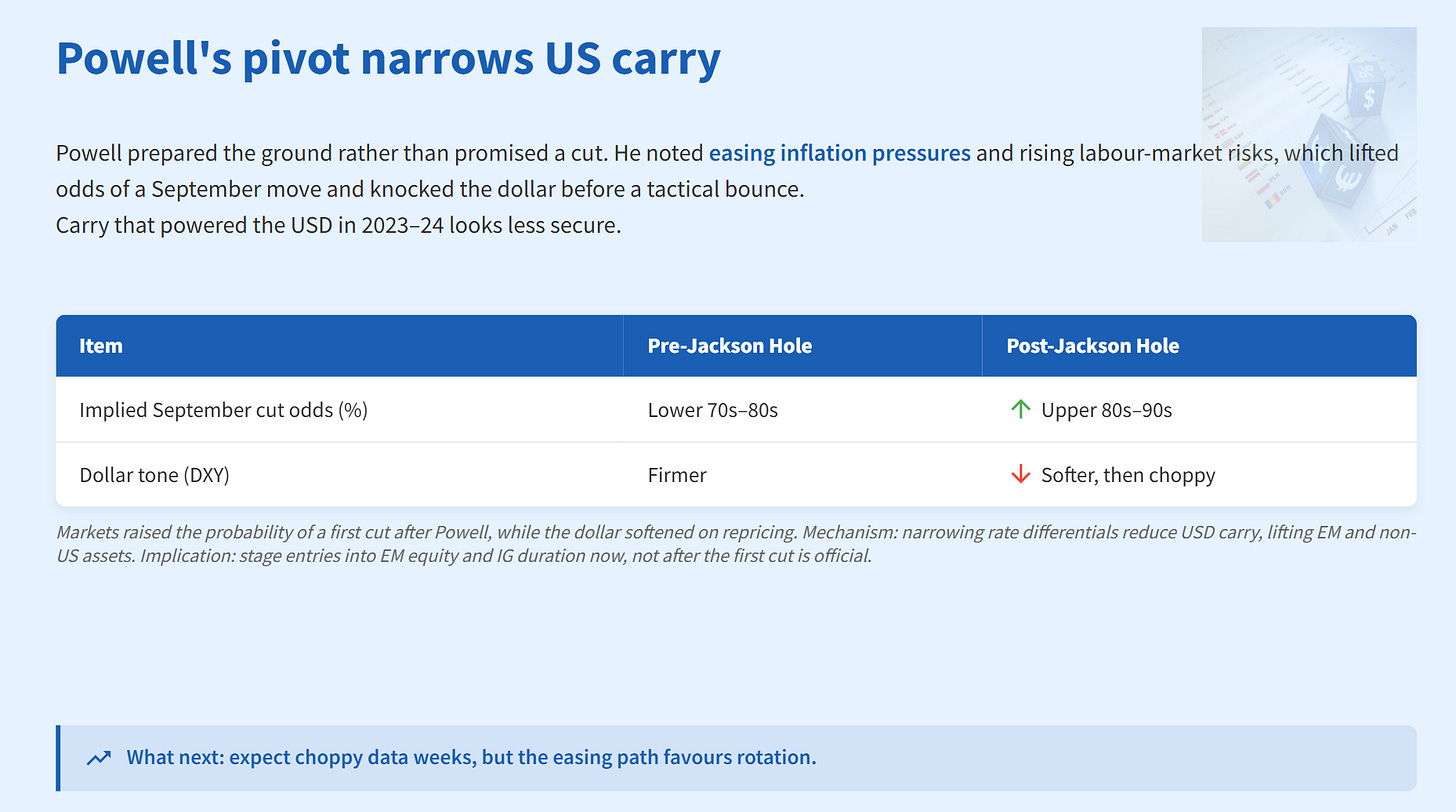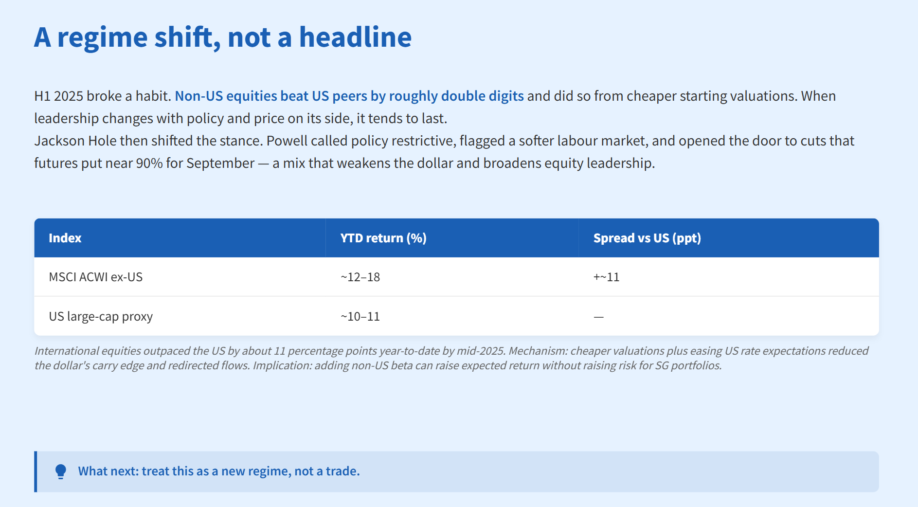 H1 2025 broke a habit. Non‑US equities beat US peers by roughly double digits and did so from cheaper starting valuations. When leadership changes with policy and price on its side, it tends to last. Jackson Hole then shifted the stance. Powell called policy restrictive, flagged a softer labour market, and opened the door to cuts that futures put near 90% for September — a mix that weakens the dollar and broadens equity leadership. What next: treat this as a new regime, not a trade.