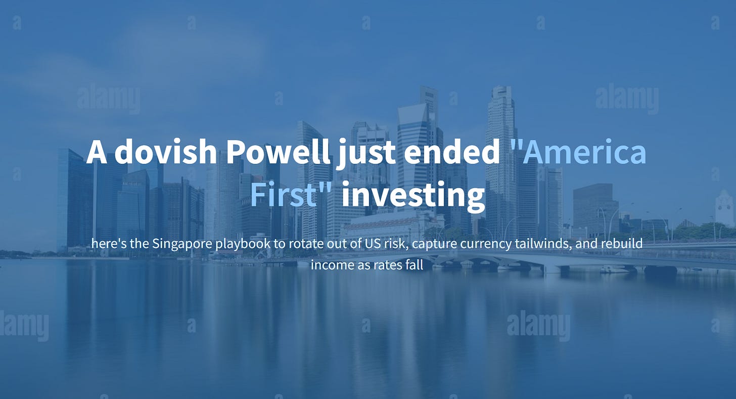 A dovish Powell just ended “America First” investing — here’s the Singapore playbook to rotate out of US risk, capture currency tailwinds, and rebuild income as rates fall