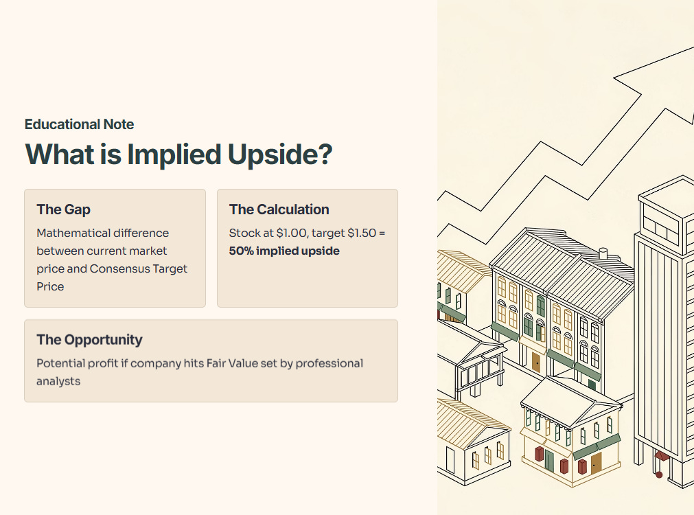 Implied Upside is the mathematical “gap” between a stock’s current market price and its Consensus Target Price (the average valuation set by professional analysts). If a stock is $1.00 and the target is $1.50, the implied upside is 50%. It represents the potential profit if the company hits its “Fair Value.